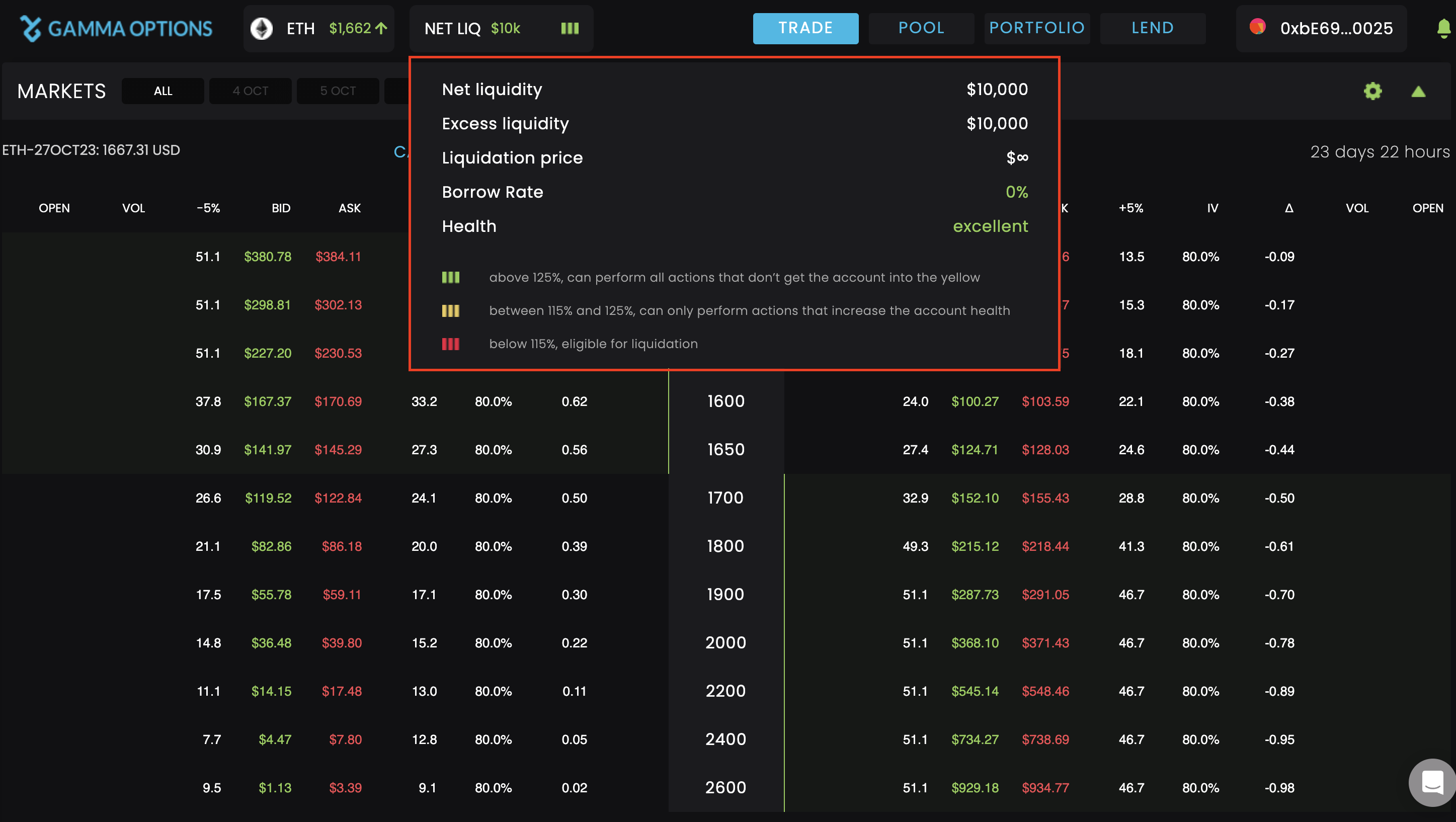 Within the GammaOptions platform, both traders and LPs are furnished with a user-friendly interface that offers multiple avenues to vigilantly monitor their margin account health and even ascertain their potential liquidation price. For a clearer understanding, refer to the following image: