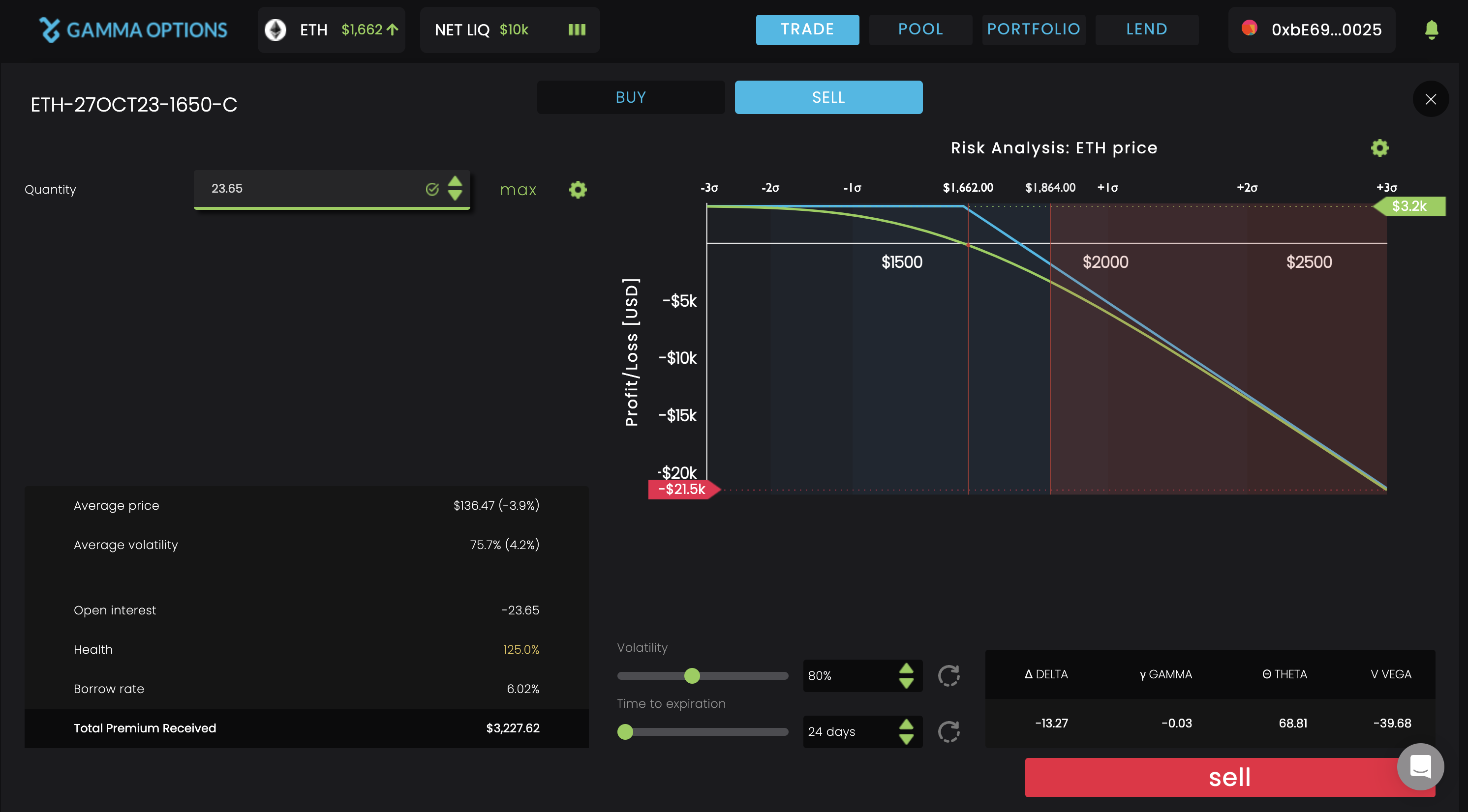 Given a $10,000 balance in the user's margin account, the platform permits the execution of sales exceeding 23 call options, leveraging a 4x factor. Consequently, the account's health metric would decline to its lowest permissible threshold of 125%. The user can see the liquidation price denominated in USD on the platform's chart. Initiation of liquidation procedures commences when the ETH price reaches $1,864.